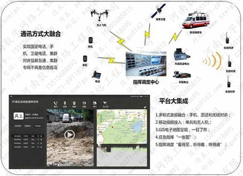 3、融合應(yīng)急通信網(wǎng)絡(luò)支持VSAT/高通量衛(wèi)星通信系統(tǒng)、天通衛(wèi)星應(yīng)急通信系統(tǒng)、3G/4G/5G圖傳系 統(tǒng)、移動 指揮系統(tǒng) 、無線通訊系統(tǒng)、視頻會議系統(tǒng)等終端。實現(xiàn)對所有終端的調(diào)度, 為事件處理提供基礎(chǔ)話音、視頻、數(shù)據(jù)等通信服務(wù),實現(xiàn)統(tǒng)一的無所不達(dá)的調(diào)度。