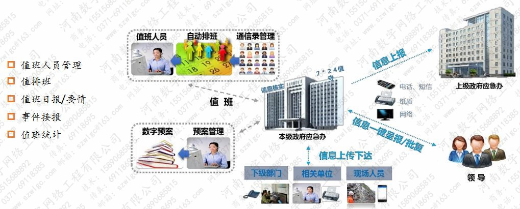 應急值守管理系統(tǒng)建立了完善的應急值班和交接班制度,對應急來往的信息進行快速 處理,上傳下達,統(tǒng)一接受來自電話、郵件、傳真、人工等硬件設備多種形式和網(wǎng)絡、手機等多種系統(tǒng)的上報信息,對上報信息進行分級和分類,平時產(chǎn)生日常事務,緊急情況下則產(chǎn)生應急事件,通過事件類型、級別等匹配對應的應急預案,自動或人工啟動預案。